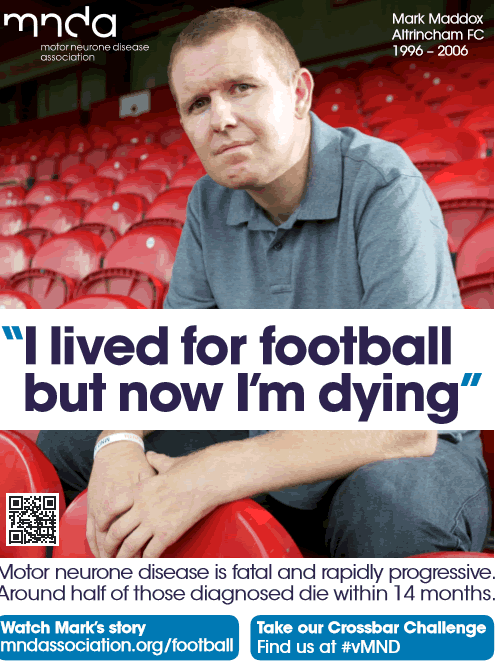 Football v MND is fronted by former professional footballer Mark Maddox. Since his diagnosis just before Christmas 2010, he has run two marathons, sky-dived and sung about the disease in two albums with his band. Now the Liverpudlian is turning to the football community to help support the MND Association’s campaign.