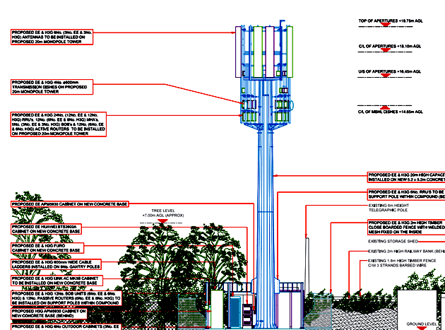 The mast would support 6 antenna apertures and four 600mm dishes and would require the installation of eight equipment cabinets at ground level within a fenced compound.