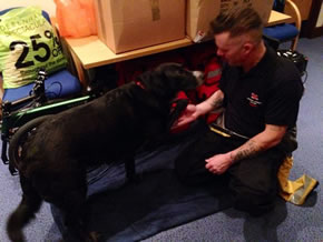 The crew looked after the dog, called Easy, during the evening before his owner came back to collect him after being released from hospital. They were delighted to be reunited.
