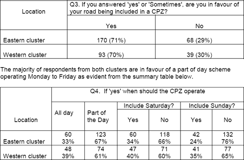The table below shows the summary of the responses to question 3 from the roads within the two clusters in favour of parking controls.