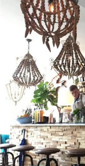 The interior is eclectic to say the least- it is like entering a tropical parlour, with palm trees, , mirrors, sofas and twinkling lamps. It is apparently inspired by Kew Gardens and the white walls and grey slate floors, give a neutral backdrop to a riot of colour in the chairs, cushions and plants. There is a bar to the left of the entrance and there are tables dotted around the front room. In the summer, the tables on the front pavement were very popular, and there is al fresco dining at the back.