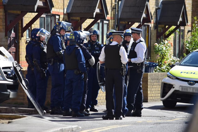Officers in riot gear assemble on Broomfield Road. Picture: Liz Jenner