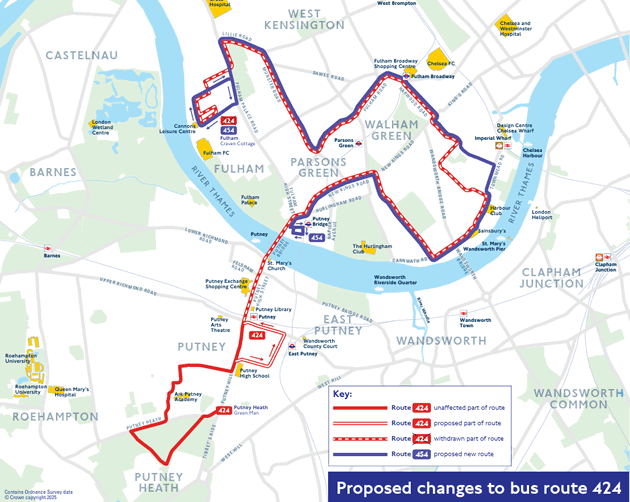 Under the plans, the 424 would be shortened to run only between Putney Heath and Putney High Street, while a new route—numbered 454—would take over the northern section between Putney Bridge Station and Fulham Football Club.