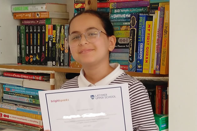 Mariem from Park Walk Primary in Fulham has just received her Bright Sparks diploma and a goody bag from Latymer Upper School.