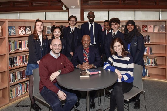 Front L-R: BBC executive producer Richard Stokes, Colin Salmon and Emilia Fox, pictured with Principal of The Hurlingham Academy, Leon Wilson (back centre) and pupils from the school
