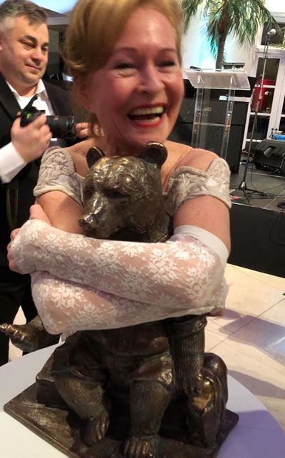Ewa Rakowska-Eggar and small model of Wojtek the bear designed by Pawel Sasin