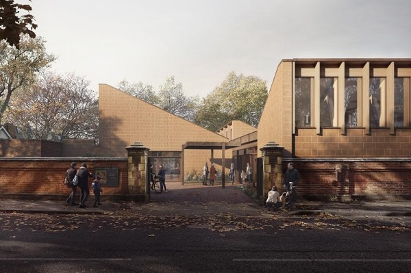 Designed by a team led by Mae Architects, the new centre will restore the original Clancarty Lodge and extend it to provide a large community hall, plus flexible hall and cafe opening onto an arts courtyard, and connecting to the terrace of the original lodge via an open lobby area.