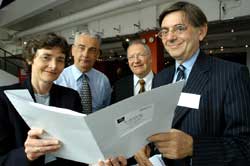 Left to right: Arts Minister Estelle Morris, Hammersmith & Fulham Council's director of education Sandy Adamson, the council's deputy for education Cllr David Williams, and Nick Stuart, chairman of John Lyon's Charity |