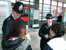 Borough youth officer, Sgt Gordon Barlow, and schools liaison officer, PC Samm Postance, stop two secondary school pupils in Hammersmith Broadway bus station. The girls were on their way to a placement at Hammersmith & West London College, so were not truanting. | |