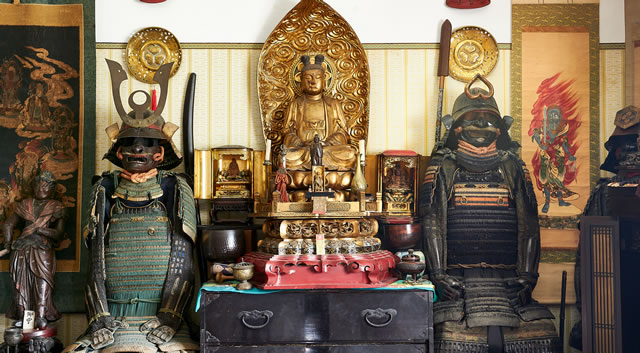 Similarly his growing collection of armour, weapons and shrines were accommodated upstairs in a small sitting room, in which one would sit, overlooked mixture of menacing helmets, fully assembled suits of armour, racks of weapons and in contrast, a range of serene Zen Buddhas, set in shrines around the wall.