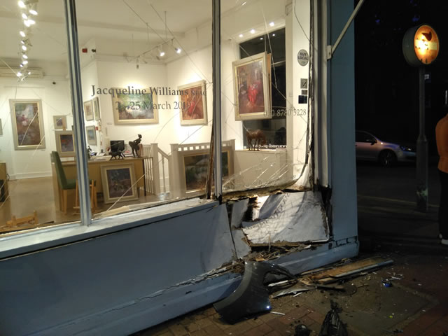 This Sunday evening (19 May) at around 9.50pm a car crashed in to the frontage of the Russell Gallery on the Lower Richmond Road. The driver of the car sped off after the collision with the police in pursuit.