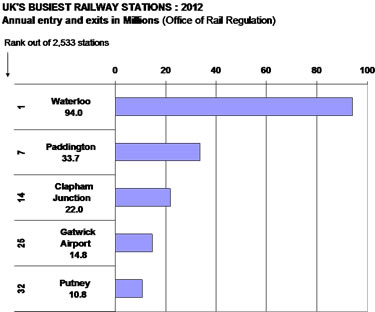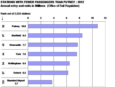 In 2012 Putney station was the 32nd most busy station in the UK with 10.8m users, Gatwick Airport (correction of earlier error) ranked 25th with only 4m more passengers. Cities around the UK that have fewer passengers include Newcastle, York, Sheffield & Nottingham: