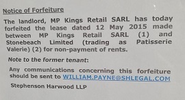 The notice says that the landlord MP Kings Retail SARL has forfeited the lease for non-payment of rent.