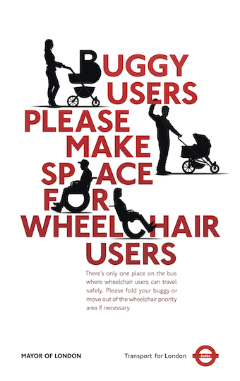 Faryal Velmi, Director of Transport for All, said: “We warmly welcome this publicity drive on London’s buses to highlight the fact that wheelchair users should have priority over buggies. The right to ride on buses has been an issue disabled people have campaigned for many years and this great initiative will help to make sure that wheelchair users have access to our space whenever we need it.”