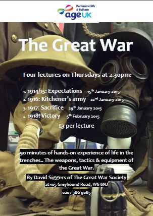 Age UK Hammersmith and Fulham is hosting four weekly lectures on The Great War at its centre in Greyhound Road beginning this Thursday, January 15 at 2.30pm.