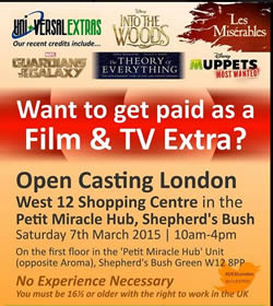 Uni-versalEXTRAS are holding an open casting on Saturday, March 7 at the West 12 Shopping Centre in Shepherd's Bush for people to work as extras in paid roles.