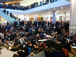The protestors, who carried banners saying "Black lives matter" chanted "I can’t breathe" which were Eric Garner's last words as police restrained him in a chokehold after arresting him. They then took part in the mass die-in by lying down on the floor of the atrium.