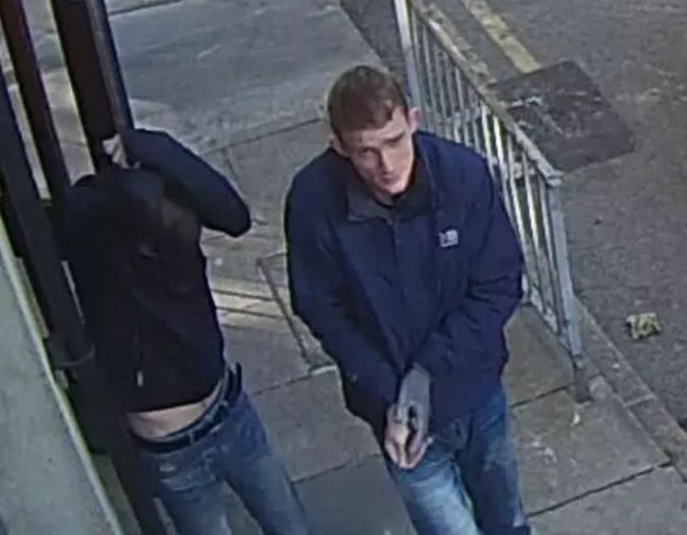 The second man is described as white, aged in his thirties, with short facial hair and rimless glasses. He was wearing a dark grey bomber jacket.