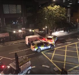 " Probably 20+ heavily armed police stopped the white van. They've got one guy in cuffs and some of the police starting to leave area."