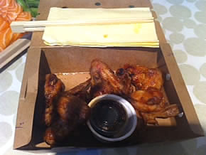 The order was for two sharing platters, one a Sushi Roll platter, (4-6 people) the second was the Gluten-Free , for two-four people. We also orderered some vegetables and Teriyaki Wings.The platters arrived promptly and there was great excitement as they were unpacked. The chicken wings were on the tepid side, so I popped them into the oven to heat them up. The delivery came with sachets of soy sauce and wooden chopsticks and there was wasabi sauce and ginger included on each platter.