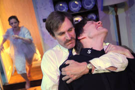 Dad Tom (John Sackville) deserted David and his Salvationist mother years ago and David loathes him. David’s already extremely fragile, a condition indicated by Sebastian Carver, boldly making his professional stage debut, with a range of facial torment that gets close to gurning. When required to laugh, he’s fine; otherwise it is as if he’s just caught his nose in the mangle.