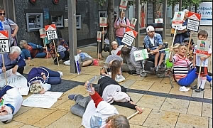 Save Our Hospitals campaigners protesting about NHS plans to close A&Es and downgrade local hospitals held a "Die-in" in Lyric Square last Saturday September 6, before joining the final section of the People's March for the NHS, walking from Red Lion to Trafalgar Square.
