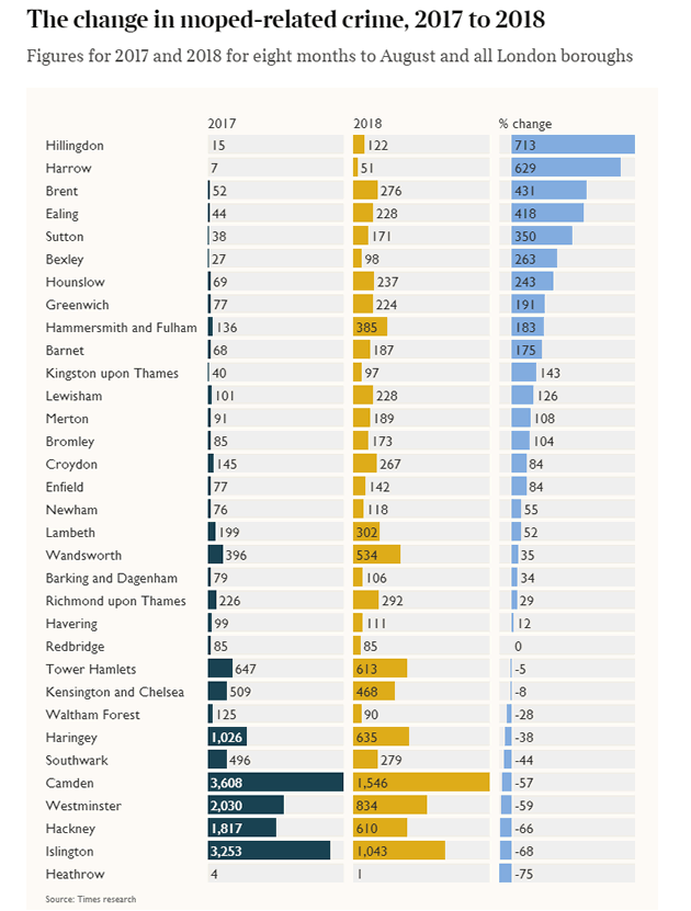 A report in the Times newspaper has published data on moped enabled crime which suggests that the Metropolitan Police’s success in reducing this type of offence may be limited to certain areas.