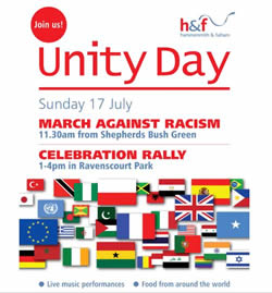 Hammersmith and Fulham Council is inviting people to "walk together against racism and xenophobia" at a Unity Day march from Shepherd's Bush Green and rally in Ravenscourt Park this Sunday, 17 July.
