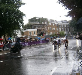 From a sunny start, the weather detoriorarated into heavy rain, thunder and lightning and the cyclists returned in atrocious conditions on Fulham Road.