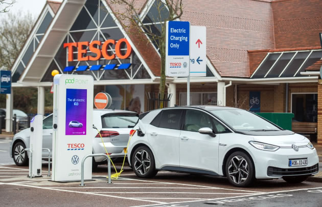 Volkswagen and Tesco have partnered to provide the largest retail electric vehicle charging network in the UK – powered by Pod Point, giving EV drivers a place to charge their cars while doing their shopping.