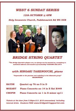Part of the West 6 Sunday Series, the concert will feature the chamber versions of Mozart and Chopin Piano Concertos as well as one of Haydn's finest quartets op 76 no5 in D with its sublime F sharp major slow movement.