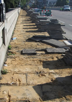 The old road surface has been removed along with the paving and some of the kerb stones on the western footway.