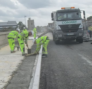 The finishing touches are being made to the footpath on the western side of the bridge, while on the eastern side a solid new concrete base has been laid to support its new paving stones.