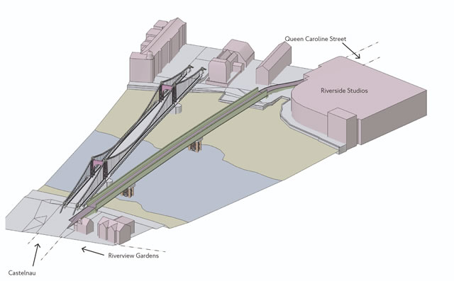 The bridge would be step-free and have a 5.5-metre-wide space for pedestrians and cyclists. It would be accessed by shallow ramps from Queen Caroline Street on the north bank, and from close to the junction of Castelnau and Riverview Gardens on the south bank.