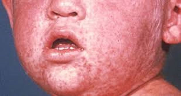 Measles is a viral infection that spreads via contact with droplets from the nose and mouth emitted when sneezing and coughing.