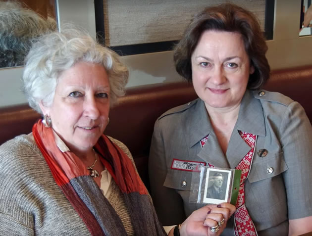 Angela (on left) holds up the photo of Peter, with Teresa, who found it
