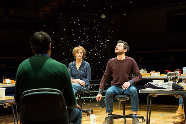 The comfortable city home is conjured up by set designer Lizzie Clachan with a motley collection of office tables and chairs, sweet wrappers, tissues, a brick, carafes and assorted glasses. Nothing that makes sense or is used for what it is actually intended. In a nursery school it would be called imaginative play. And indeed there’s a truly captivating sequence when Bettina and Konrad conjure up a Christmas tree out of sticky tape and the contents of a wastepaper bin.