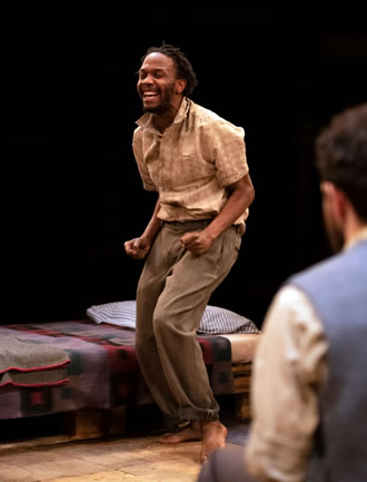 Today's audiences don't have that immediate context in which to view the characters and it therefore takes a while to understand what we are seeing. Which is a shame because it slows the play. At face value there is a dirt-poor white man, Morrie, obviously educated, but hiding in a shanty town hut (well captured by designer Basia Bińkowska), and waiting each day for an exhausted, sore-footed black man, Zach, to return home for Morrie's foot rubs, food, bible readings and sleep. Morrie shares with him his dreams of a farm just made for two; the disinterested Zach's mind is on his first, rather violent, sexual encounter with a seemingly unwilling girl called Connie.