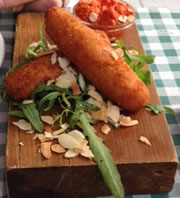 The sweet potato & goats cheese croquettes (£5) were served with a romesco sauce (a Catalan sauce made of red pepper, almonds, bread and good oil) and rocket with grilled almonds. The croquettes proved to be that rare combination of light but filling, with the rocket and almonds adding just the right amount of zing and crunch.