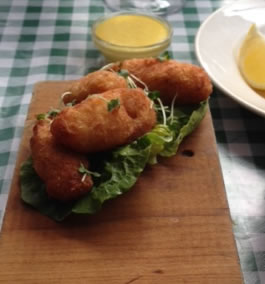 The salt cod fritters (£5.75) (pictured right) came with aioli, there were four salt cod fritters, which was just enough for lunch along with the mezza accompaniments. The aioli was rather moreish and went well as a dip with the flakey cod.