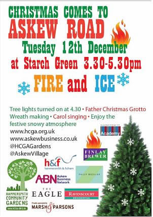Come along on Tuesday 12 December from 3.30pm till 5.30pm to enjoy the festive snowy atmosphere and see the tree lights switched on at Starch Green, north of Ravenscourt Park.