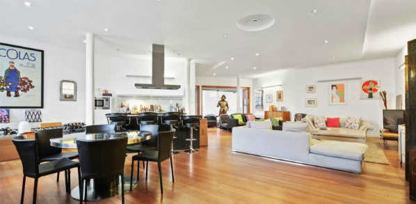 The vast open plan reception/dining/integrated kitchen in this contemporary W12 loft style flat for sale features solid wooden flooring, high ceilings and high quality appliances.